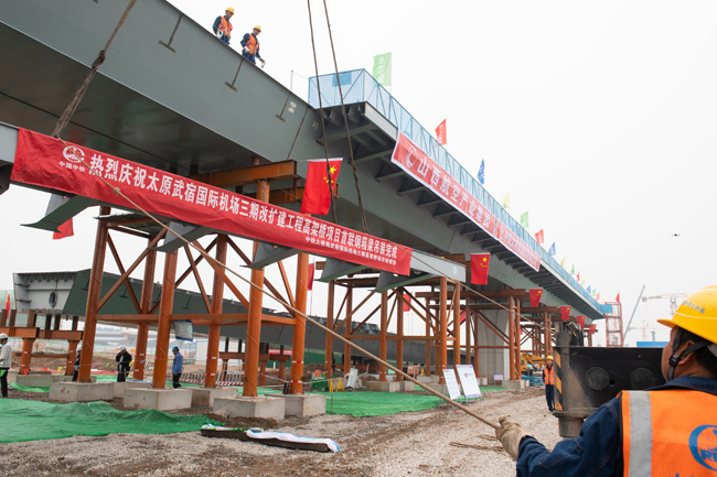 2024年9月27日,隨著太原武宿國際機場三期改擴建工程高架橋項目首聯(lián)鋼箱梁最后一節(jié)挑臂穩(wěn)穩(wěn)地落在支架上,標志著高架橋項目建設取得關鍵性進展,進入鋼箱梁架設新階段。